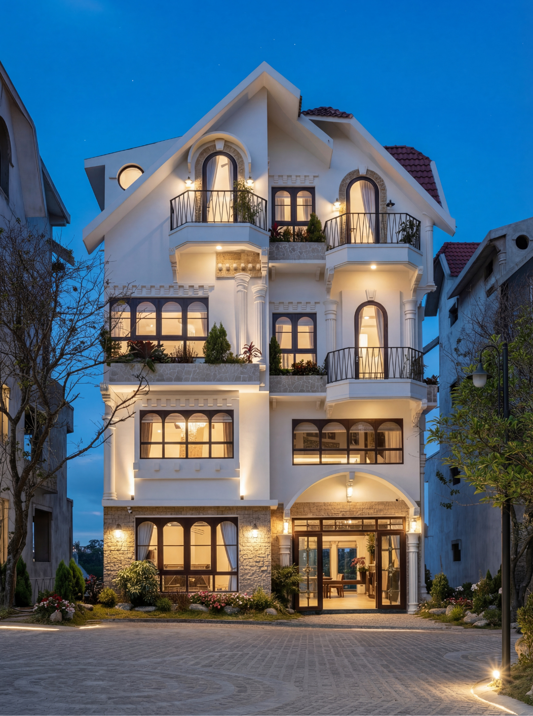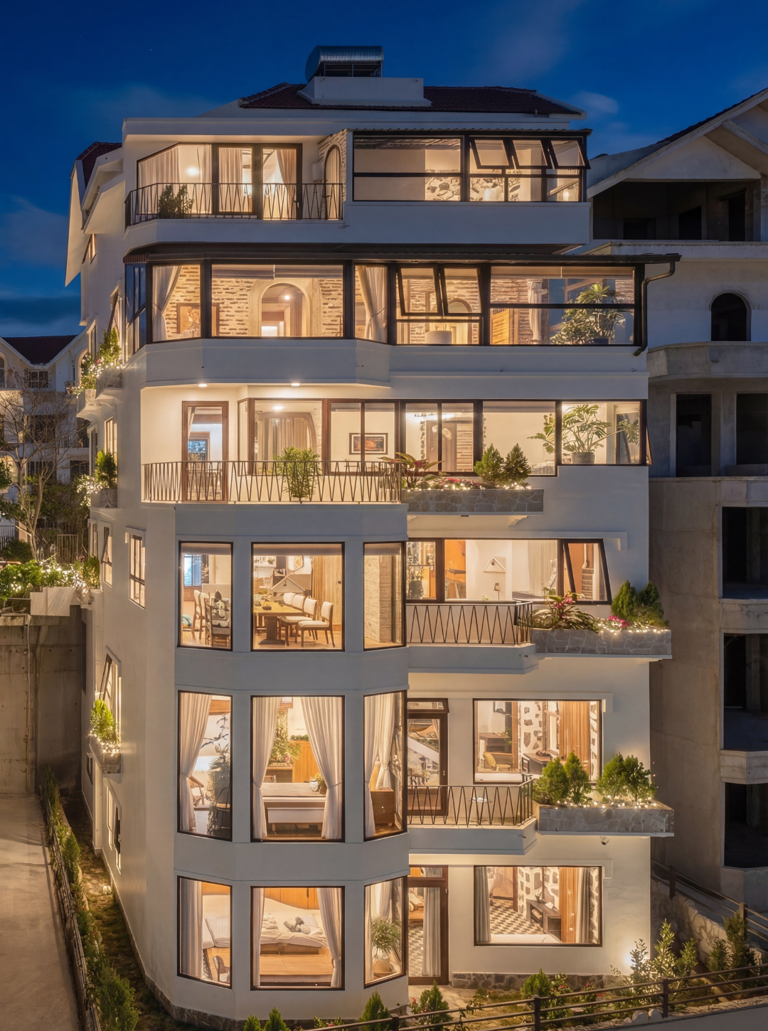 Mỗi căn được thiết kế như một villa nghỉ dưỡng độc lập: 5–6 tầng, 5–6 phòng ngủ, có sân vườn và gara riêng, phù hợp cho cả nhu cầu nhà nghỉ dưỡng, lẫn khai thác lưu trú chuyên nghiệp.